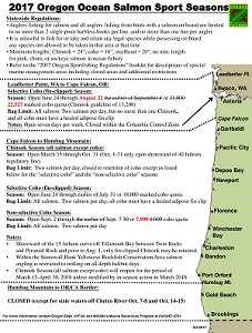 "Cape Falcon to Humbug Mountain: Chinook Season (all salmon except coho): Season: Open March 15 through Oct. 31 (Oct. 1-31 only open shoreward of 40-fathom regulatory line) Bag Limit: Two salmon per day,"